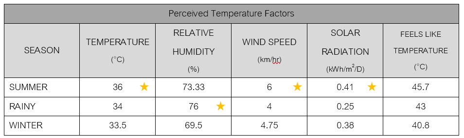 The Meteorological Department's 2021 weather data show average maximum temperatures in the summer, rainy season, and winter of 36°C, 34°C, and 33.5°C. Foreca, an accurate weather forecast data source, said average relative humidity in summer is 73.33%RH, in the rainy season is 76%RH, and in winter is 69.5%RH. Wind speed averages 6 km/hr in summer, 4 km/hr in the rainy season, and 4.75 km/hr in winter.​