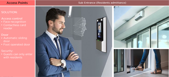 1) Face Recognition ใช้ระบบสแกนใบหน้า เพื่อควบคุมการเข้า-ออก โดยนอกจากการสแกนใบหน้าแล้ว ยังสามารถตรวจวัดอุณหภูมิได้อีกด้วย