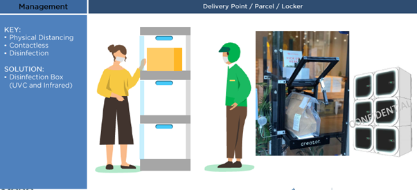 1) Infection Prevention โดยจะมีการประกาศหลักการทำลายเชื้อในยุคการระบาดของโรค COVID-19 และ วิธีการทำความสะอาดอาคารสถานที่ที่ถูกต้อง มาตราการการเว้นระยะเพื่อลดความเสี่ยงการแพร่กระจายเชื้อโรค รวมถึงการออกแบบเพื่อลดการพบปะและการสัมผัส เช่น การติดตั้งกล่องฆ่าเชื้อ (Disinfection Box) เพื่อฆ่าเชื้อบนกล่องพัสดุก่อนถึงมือลูกบ้าน การฝากพัสดุไว้ในล็อคเกอร์เพื่อลดการพบปะทางกายภาพ เพื่อให้ผู้อาศัยสามารถเข้าใจและปฏิบัติได้อย่างถูกต้องและถูกหลักอนามัย