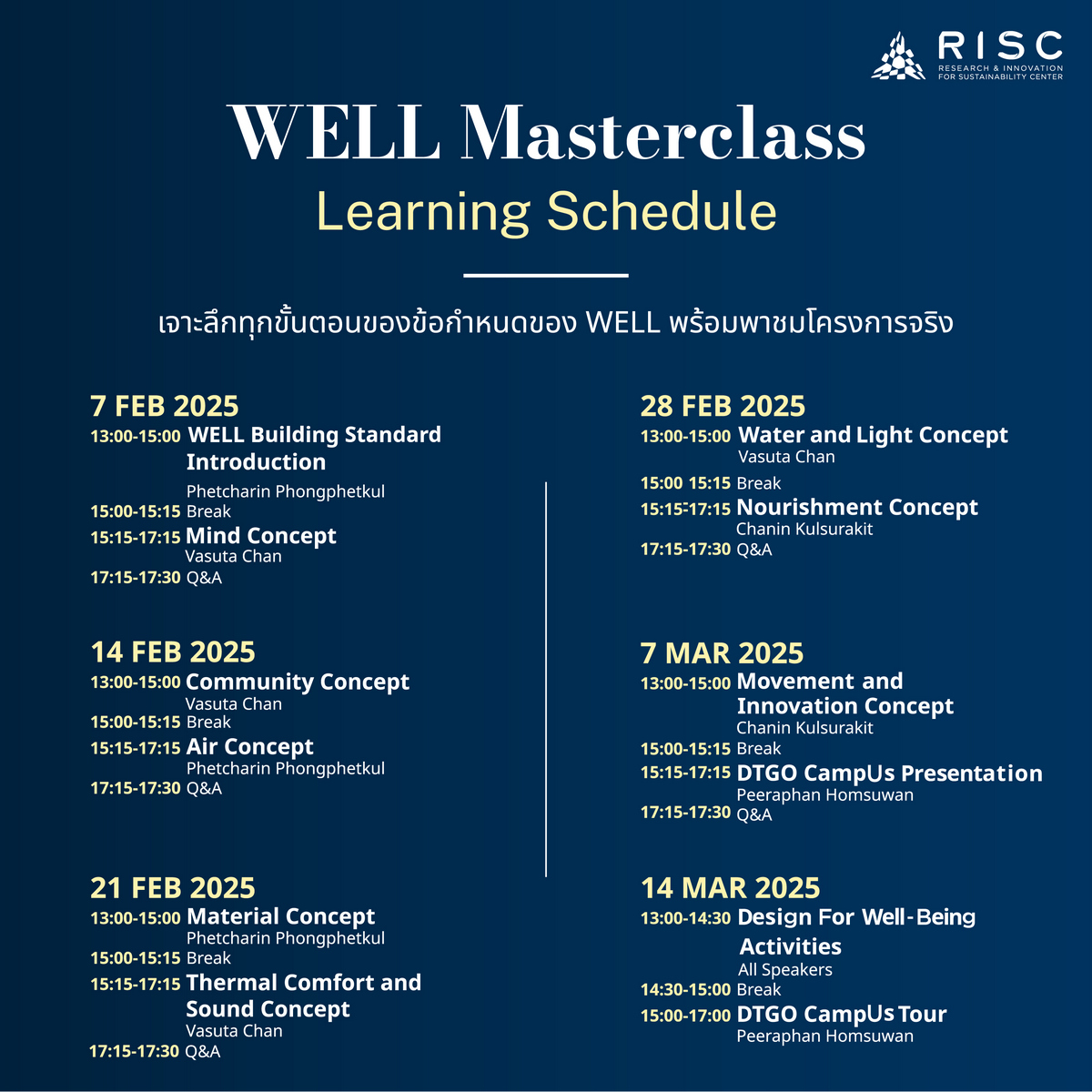 ร่วมยกระดับสู่อนาคตแห่งการพัฒนาอสังหาริมทรัพย์อย่างยั่งยืน ด้วย "WELL Masterclass" คอร์สอบรมที่จะช่วยให้คุณสร้างสรรค์พื้นที่ที่ใส่ใจสุขภาพ ความเป็นอยู่ที่ดี และความยั่งยืน ผ่าน WELL Building Standard พร้อม Workshop จำลองการนำ WELL Building Standard มาประยุกต์ใช้ในการพัฒนาโครงการ และการแลกเปลี่ยนความรู้กับ “ผู้เชี่ยวชาญที่ผลักดันให้โครงการผ่านการรับรอง WELL Building Standard แห่งแรกในไทยและเอเชียตะวันออกเฉียงใต้”