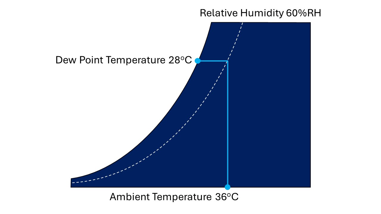 แผนภูมิที่ 1 Psychrometric Chart แสดงอุณหภูมิจุดน้ำค้างที่ 28 °C เมื่ออุณหภูมิอากาศภายนอก 36 °C และความชื้นสัมพัทธ์ 60%RH​