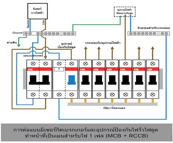 2. ติดตั้งที่วงจรย่อย เช่น ติดตั้ง RCCB กรณีนี้จะมีวัตถุประสงค์เพื่อป้องกันอันตรายต่อบุคคลจากการถูกไฟฟ้าดูดเป็นหลัก​