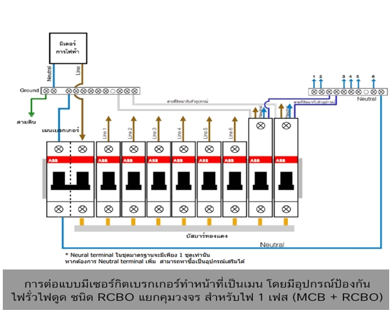 1.  ติดตั้งที่แผงเมนสวิตช์ เช่น ติดตั้ง RCBO แทนเซอร์กิตเบรกเกอร์เมน กรณีนี้จะมีวัตถุประสงค์เพื่อป้องกันอัคคีภัยเป็นหลัก​