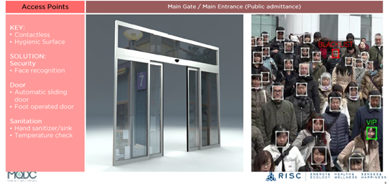 1) Face Recognition ใช้ระบบสแกนใบหน้า เพื่อควบคุมการเข้า-ออก โดยนอกจากการสแกนใบหน้าแล้ว ยังสามารถตรวจวัดอุณหภูมิได้อีกด้วย