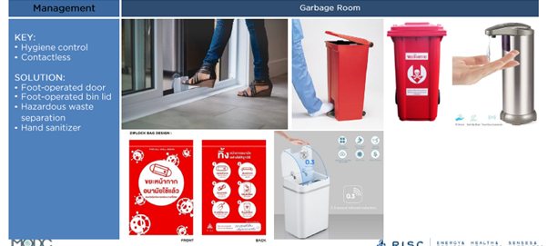 3) Waste Disposal ทุกโครงการจัดเตรียมถังขยะหรืออุปกรณ์สำหรับทิ้งหน้ากากอนามัยที่ใช้แล้วโดยเฉพาะ เพื่อลดความเสี่ยงของการแพร่กระจายเชื้อโรค และเพื่อการนำไปกำจัดทิ้งอย่างถูกต้อง เช่น ถุงแดงซิปล็อคจำกัดเชื้อ สำหรับทิ้งหน้ากากอนามัยที่ใช้แล้ว โดยจะมีการแจกให้กับลูกบ้านของ MQDC เพื่อยังเป็นการเตือนให้รู้ว่าเป็นขยะอะไร และระวังในการสัมผัสอีกด้วย