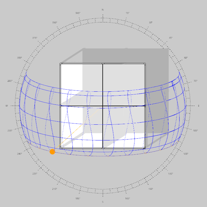 จากแบบจำลองแสงสว่างในวันที่ 21 ธันวาคม พ.ศ. 2567 เวลา 15.00 น. แสดงให้เห็นถึงความสำคัญของการเลือกตำแหน่งการใช้งานพื้นที่ในแต่ละด้านของอาคารได้ว่า ภายในห้องทิศตะวันออกเฉียงเหนือมีค่าแสงสว่างเฉลี่ย 1,078 ลักซ์ โดยไม่มีแสงแดดสาดเข้ามาภายในห้อง ส่วนห้องในทิศตะวันตกเฉียงใต้เป็นห้องที่มีค่าแสงสว่างมากเกินไปเฉลี่ยสูงที่สุด 11,229 ลักซ์ ซึ่งมาพร้อมกับแสงแดดที่มีความร้อน ทิศตะวันตกเฉียงใต้จึงเป็นทิศที่ควรหลีกเลี่ยง ไม่ควรใช้เป็นพื้นที่ทำงานเป็นประจำ